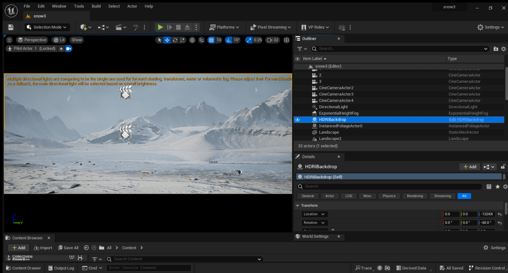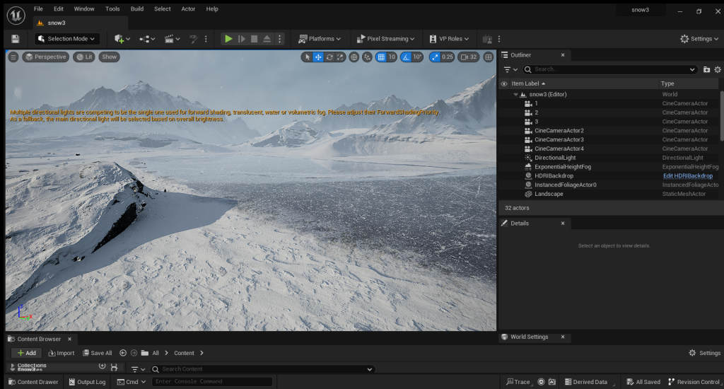 For the snow assets, I used the Quixel Bridge model and adjusted the material in UE5. In addition to the texture of the material, I also used nodes to make the rocks look like snow.