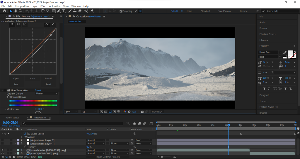 In AE, I mainly do editing and colour correction. The scene made in UE looks flat. I wanted the picture to look more layered, so I used the Curve tool to adjust the contrast between the front and back. In real scenes, there is often fog in the distance of the ground, so I blurred the horizon of the mountain and sky to make it more realistic. Then I also adjusted the overall tone because I wanted to present the cold feeling of the project. I chose a blue tone to make the environment bluer and more consistent overall.